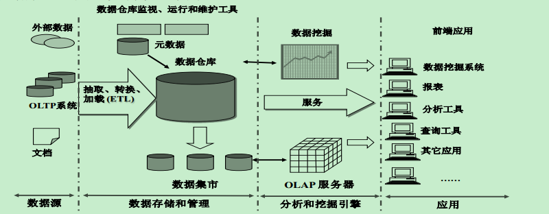 | 数据采集 | 利用ETL工具将分布的、异构数据源中的数据如关系数据、平面数 据文件等,抽取到临时中间层后进行清洗、转换、集成,最后加载 到数据仓库或数据集市中,成为联机分析处理、数据挖掘的基础; 或者也可以把实时采集的数据作为流计算系统的输入,进行实时处 理分析 |