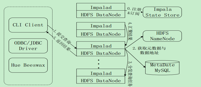 • 第4步, Query Executor通过流式交换中间输出, 并由Query Coordinator汇聚来自各个impalad的结果。